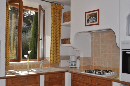 The terrace, surrounded by flowers and greenery, it has a nice teak table, chairs, and arbor for your dining and relaxation. The frame is covered by a nice trumpet vine (bignone). The northern terraces enjoy cool shade in the afternoon summers - a sought after spot from the bright Provencal sun. Inside, you will enjoy a nice living area, decorated with joyful Provencal fabrics, an open bright kitchen with microwave, stove, and dishwasher. Also included is a washing machine.